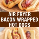 Air Fryer Bacon Wrapped Hot Dogs are going to change the way you make hot dogs forever! Hot dogs are stuffed with string cheese and wrapped in bacon before getting air fried to perfection. Even the bun gets toasted in the air fryer! And it's all ready in about 15 minutes!