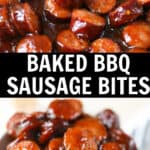 Easy 5 ingredient dinner or party snack! Baked BBQ Sausage Bites are sliced smoked sausages baked in a brown sugar BBQ sauce until the sauce is sticky and coats the sausage perfectly.