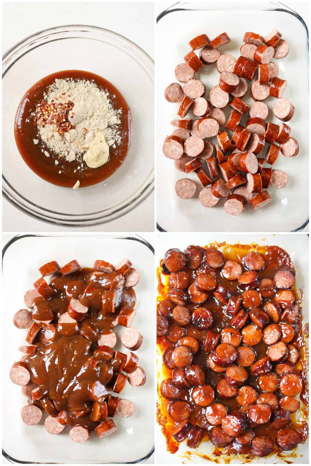 You whisk together a quick 4 ingredient sauce, pour it over the sliced sausages, and bake for 45 minutes.