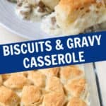Classic sausage gravy baked with refrigerated biscuits on top. Biscuits and Gravy Casserole is an easy breakfast recipe the whole family will love!