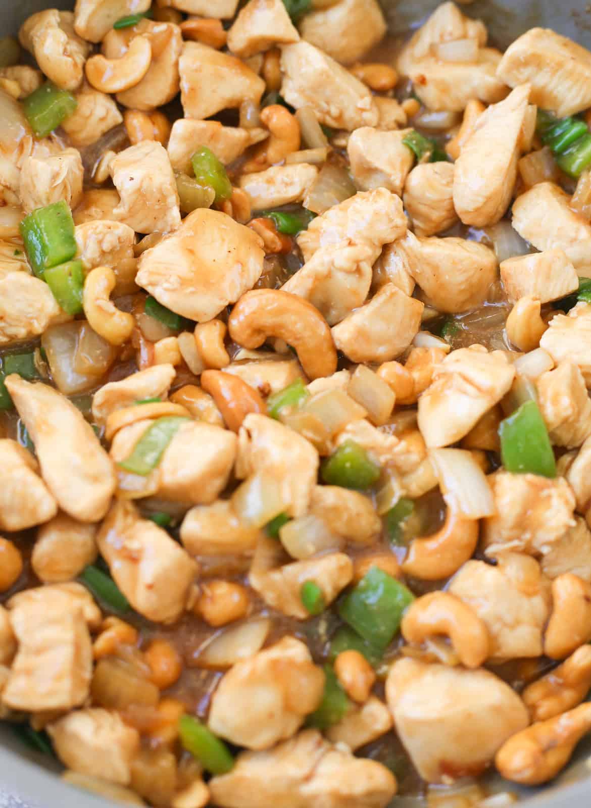 - Combine. Add cooked chicken and cashews and stir to combine.