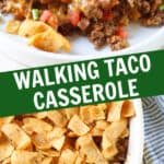 Walking Taco Casserole is everything you love in a walking taco baked together! Seasoned ground beef, pinto beans, and Rotel layered with Fritos. Top with all your favorite walking taco toppings!
